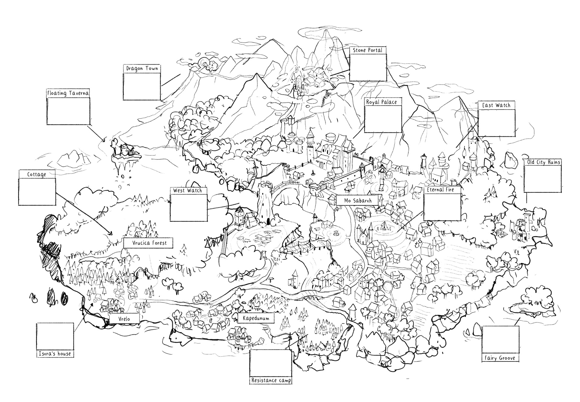 Lo que ves aquí arriba es un mapa antiguo y preciado de Bosana. Puedes notar varios ríos que fluyen por un terreno, ejem, no tan cuidadosamente dibujado: una montaña por allí, un bosque por allá y un pueblecito más abajo. Está claro que el cartógrafo no era muy fanático de la precisión y se inclinaba más por la velocidad que por el detalle.